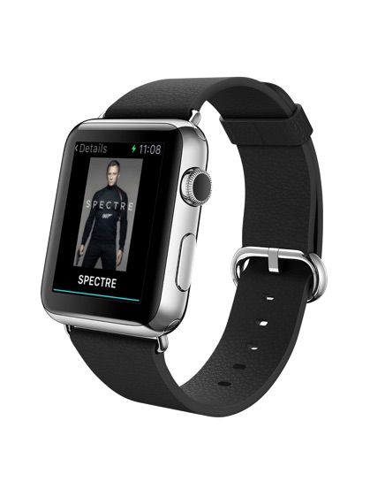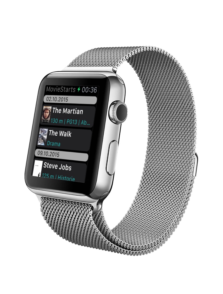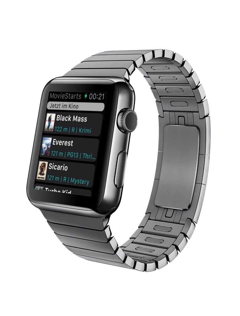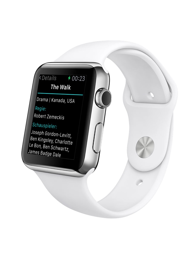 Auf deiner Apple Watch kannst du die Favoritenliste ansehen, die du auf dem iPhone erstellt hast. Durch Tap auf einen Titel in der Liste gelangst du (wie in der iPhone-App) zu den Details. Die Watch-App ist für watchOS 2 entwickelt und kann nach dem Abgleich der Favoritenliste mit dem iPhone auch unabhängig vom Telefon betrieben werden.