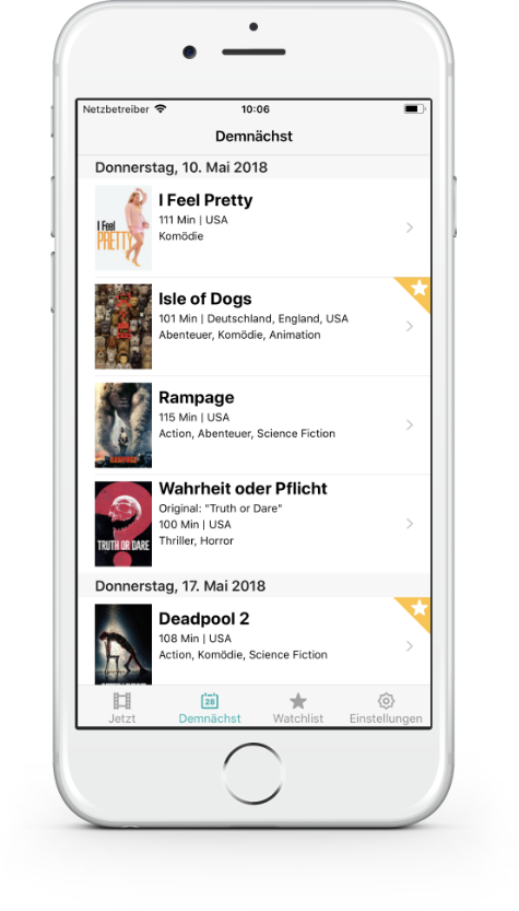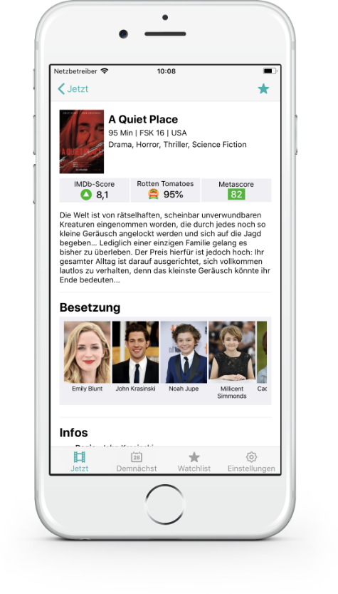 Mit dieser App hast du endlich alle aktuellen und kommenden Kinofilme im Blick. Schnell, übersichtlich und ohne Schnickschnack.