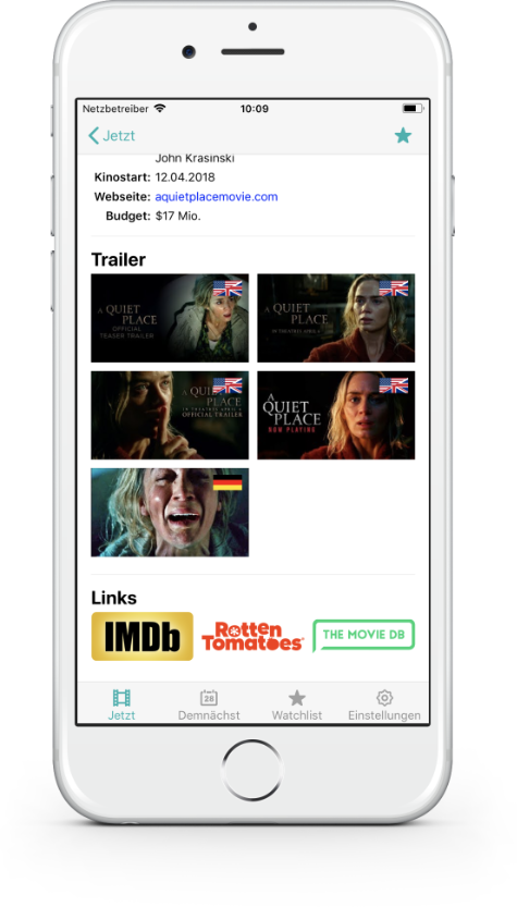 Links zu IMDb, Rotten Tomatoes und TMDb für zusätzliche Infos, sowie zu YouTube für Filmtrailer.