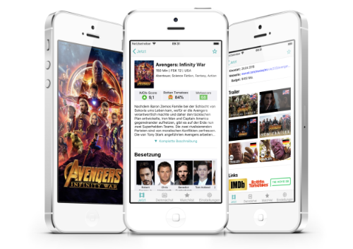 Stöbere durch aktuelle Kinofilme, markiere die besten als Favoriten und lasse sich via Push-Mitteilung erinnern, wenn sie ins Kino kommen.